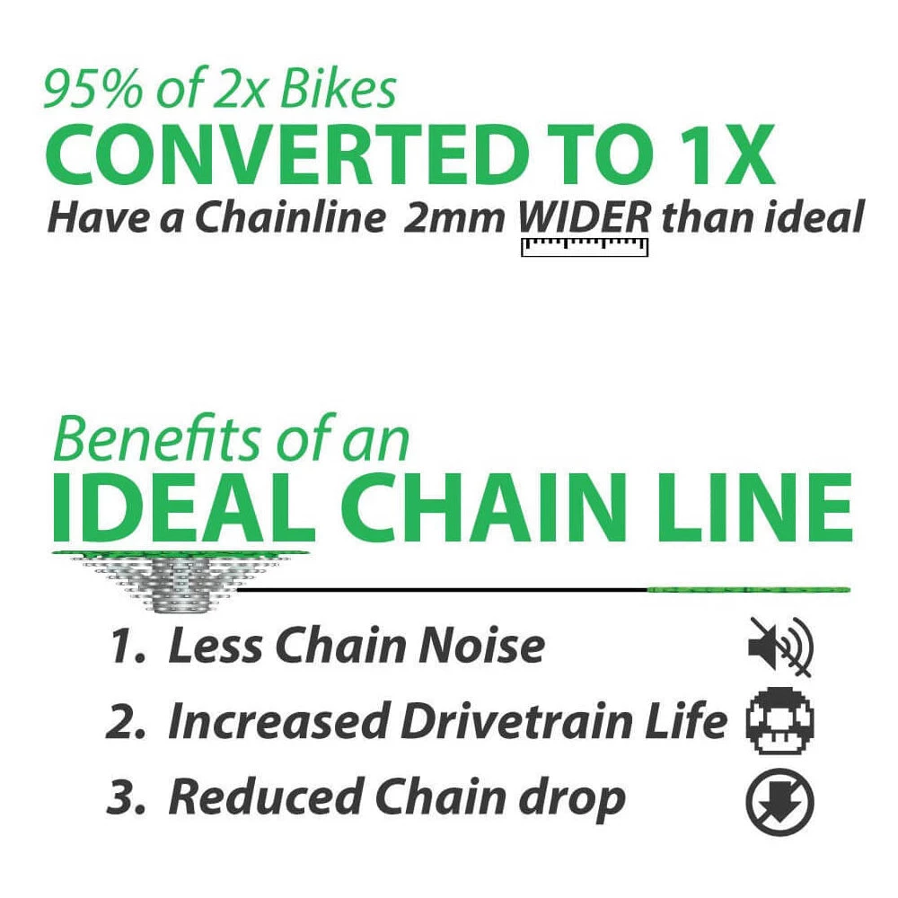 - Perfect 49mm chainline with 2mm Shims included for a quieter drivetrain, improved chainring wear and best no drop performance.