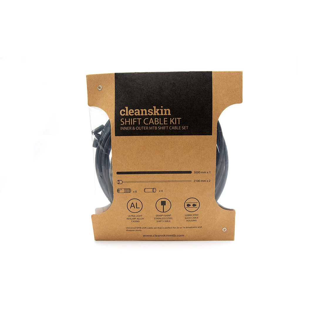 The Cleanskin Shift Cable Kit is perfect for any mountain biker looking to build or replace the cables on their ride. This complete kit features two stainless steel shift cables for smooth shifting along with a pre-lubed Kevlar reinforced outer casing. It also includes end caps and cable tips to complete the job with spares to boot!