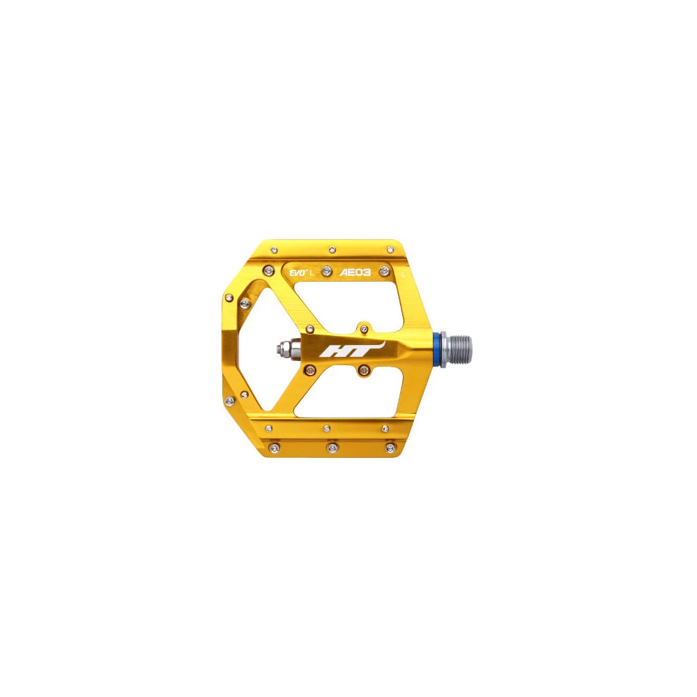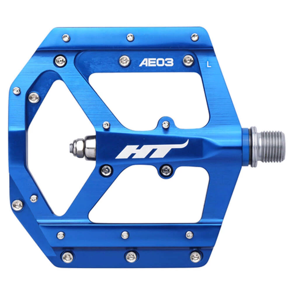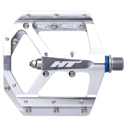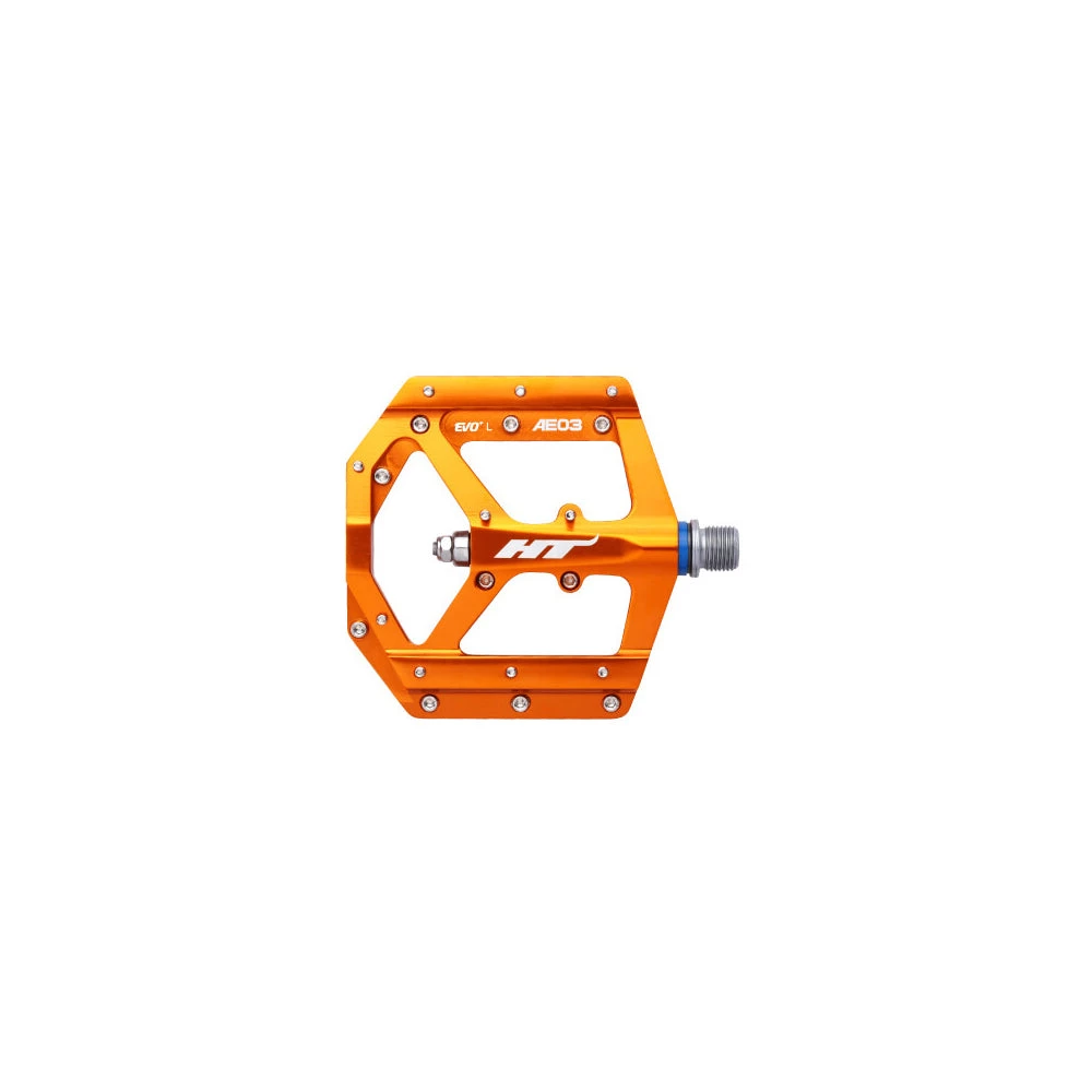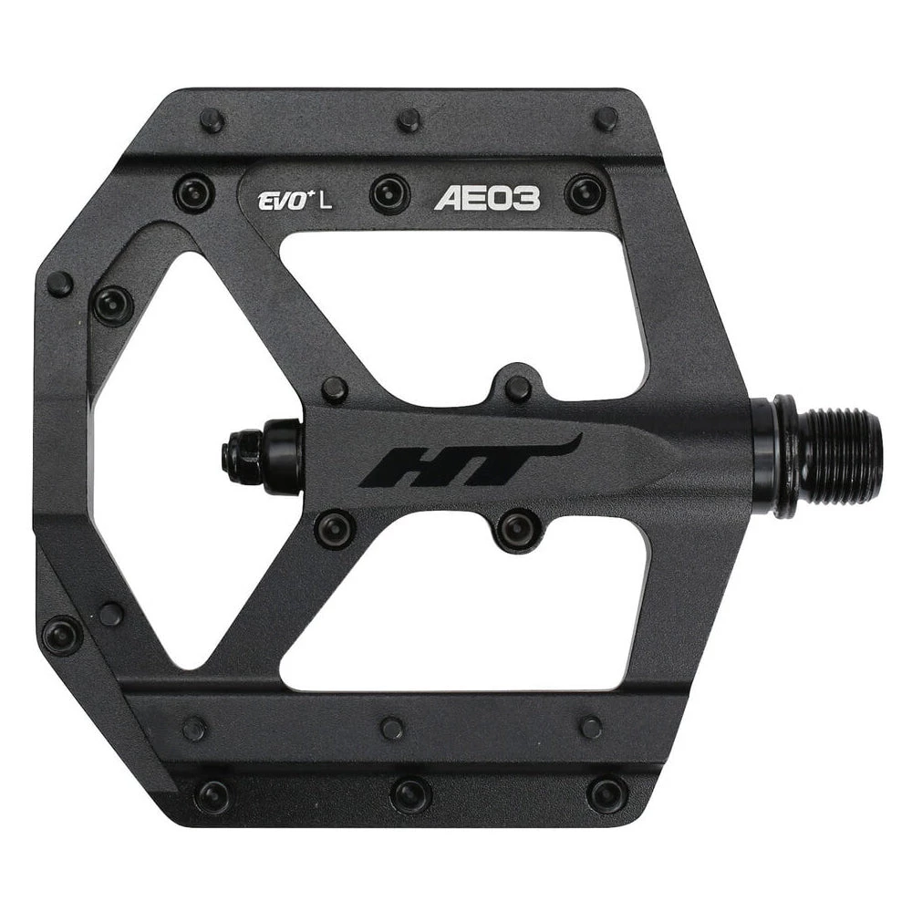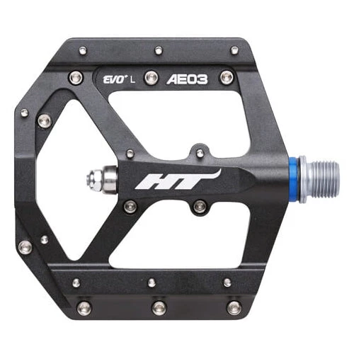 If you ride flat pedals in rough terrain, the HT AE03 pedals are an outstanding choice.  The slim body gives you precious clearance from roots and rocks while keeping your foot close to the axle for control.  With 10 replaceable pins and featuring the all-new EVO+ bearing system, with needle bearings and IGUS bushings these pedals are built to last you seasons of solid performance.  Â