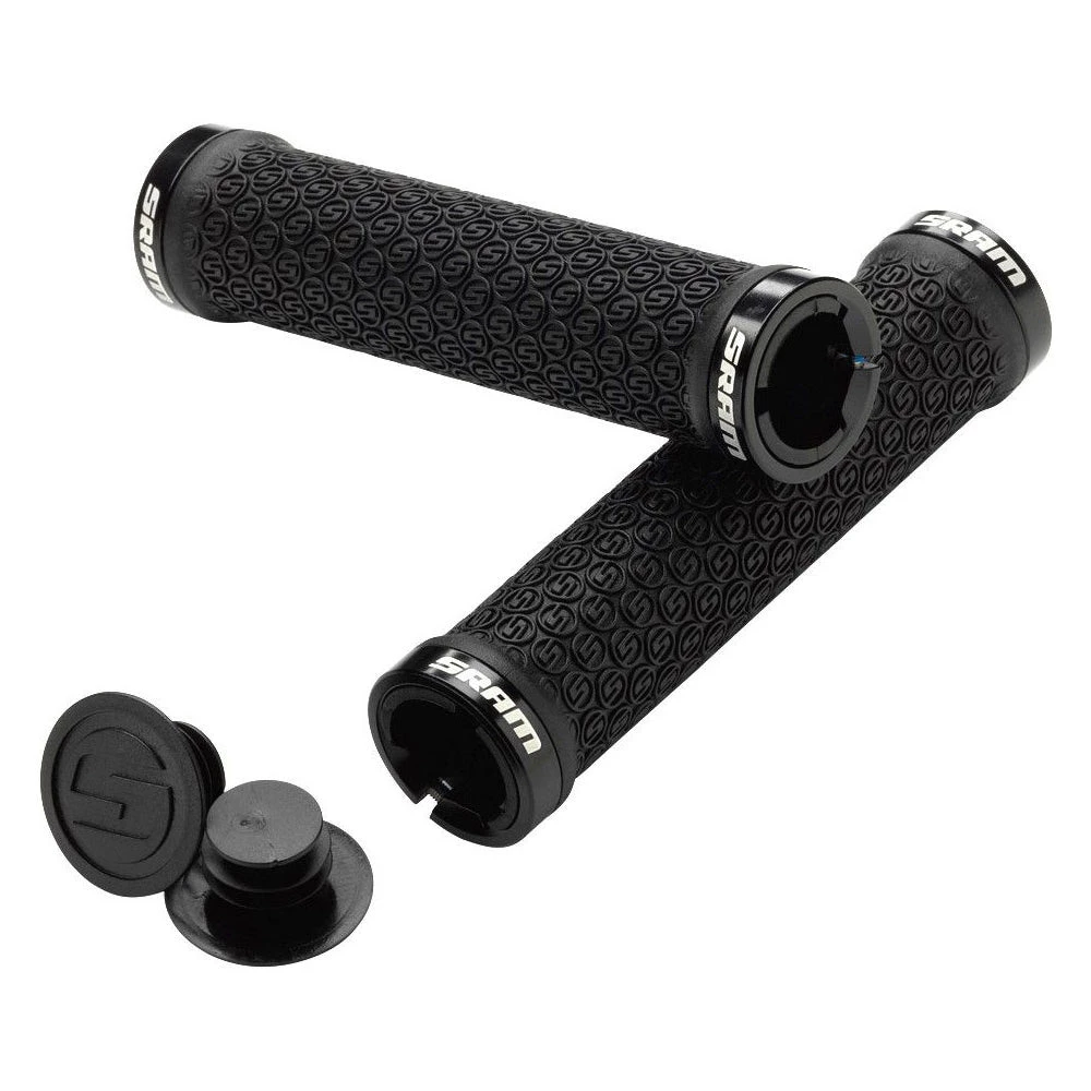Mountainbike grips with dual lock-on clamps with an embossed textured logo for grip and matching end plugs.