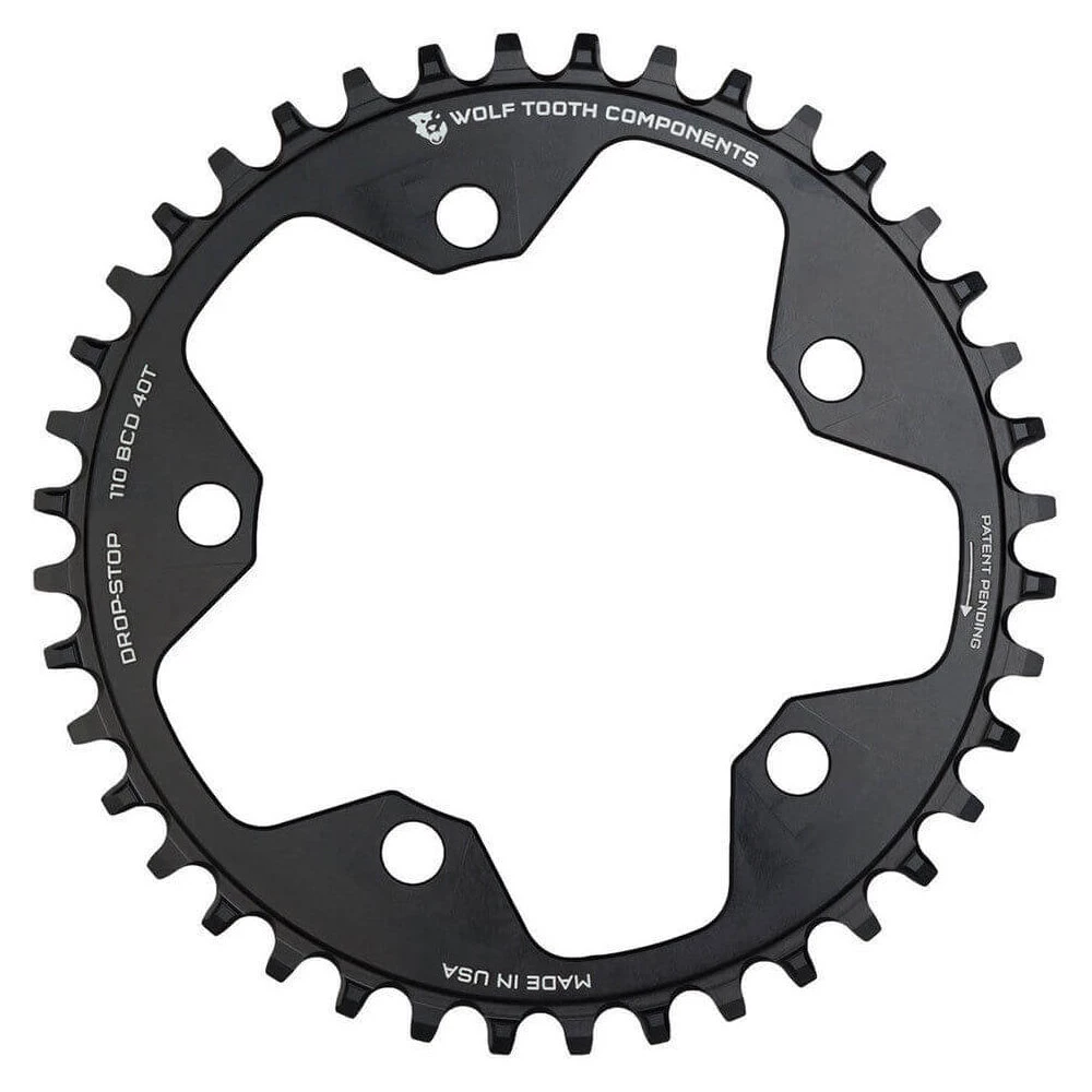 Drop-Stop technology is Wolf Tooth’s patented wide/narrow chainring design. The wide side of the tooth has maximum contact on the drive side which spreads the load and improves chainring life. The narrow side allows clearance for mud and debris which reduces friction. Alternating wide/narrow tooth pattern prevents chain derailment