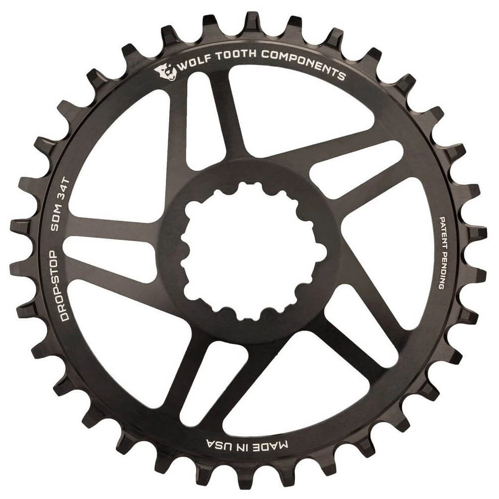 Drop-Stop technology is Wolf Tooth’s patented wide/narrow chainring design. The wide side of the tooth has maximum contact on the drive side which spreads the load and improves chainring life. The narrow side allows clearance for mud and debris which reduces friction. Alternating wide/narrow tooth pattern prevents chain derailment.